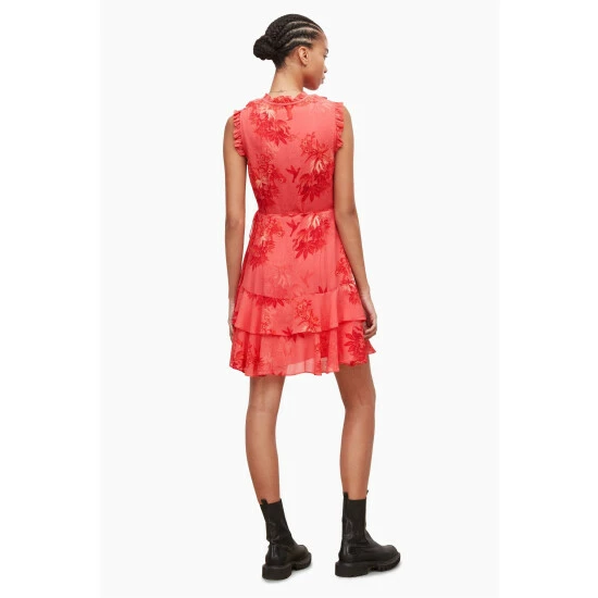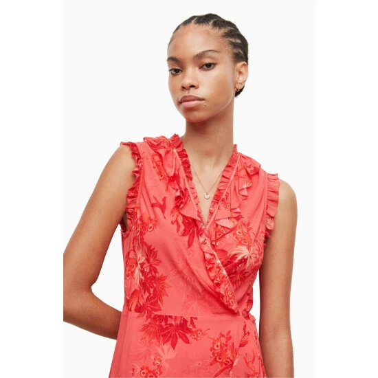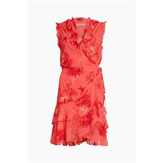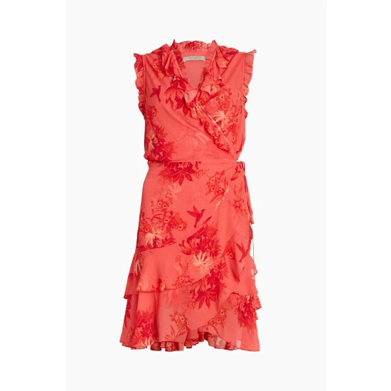 Featuring a V-neck, sleeveless design, printed sheer wrap dress with cute short summery wrap dress with frill detailing on the skirt, sleeveless with frills finishing the armholes and running down the necklines and internal button to aid in helping with the secure fit of the wrap dress.