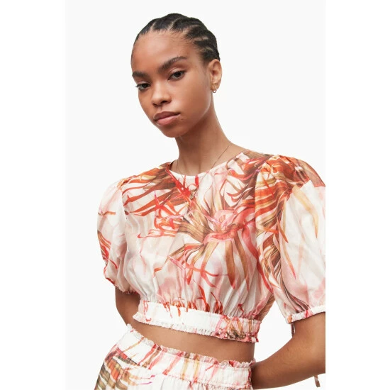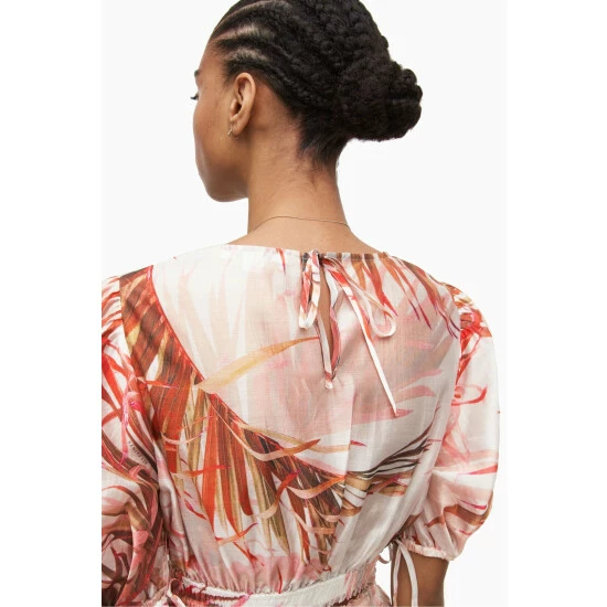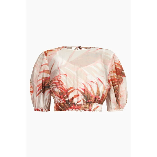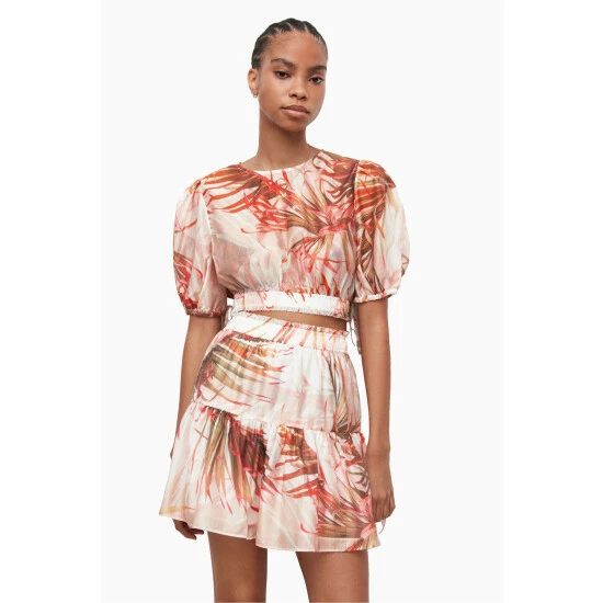 Pull over. Regular fit. Short length. Crew neck. Printed cropped top. Back neck tie detail. elasticated waistband with a frill edge finish. Short sleeve with an elasticated cuff.