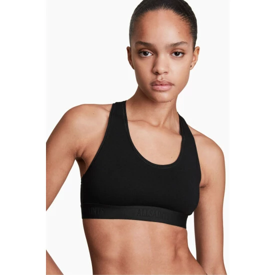 Bralet. Scoop neck. Racer back. Lined with self fabric. AllSaints branded elastic. ALLSAINTS cotton products support more sustainable cotton farming. Better Cotton is sourced via a system of Mass Balance.