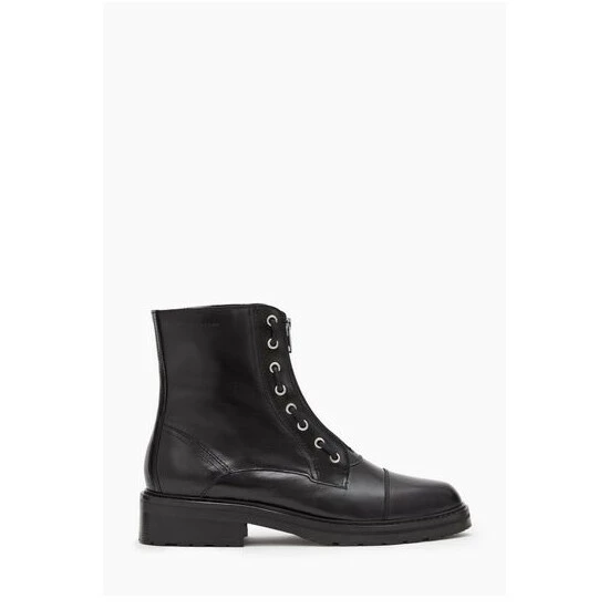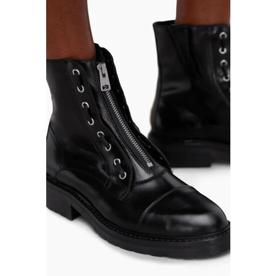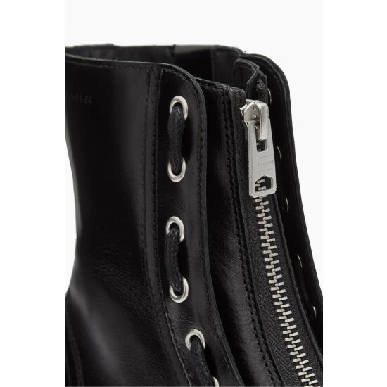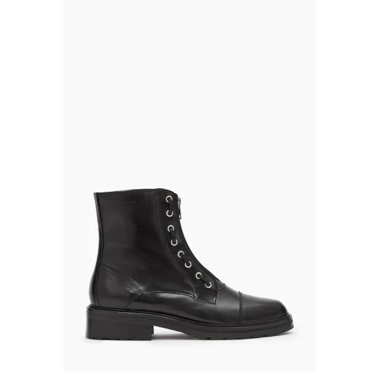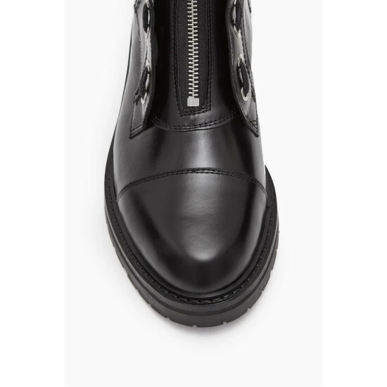 Round toe. Metal eyelet laces. Zip closure. Chunky heel. High shine finish. AllSaints leather products support responsible manufacturing via the Leather Working Group. Heel height: 3.8cm. Upper: 100% cow leather.