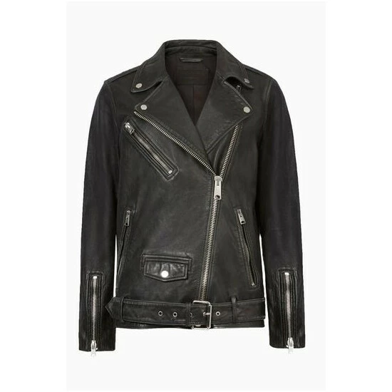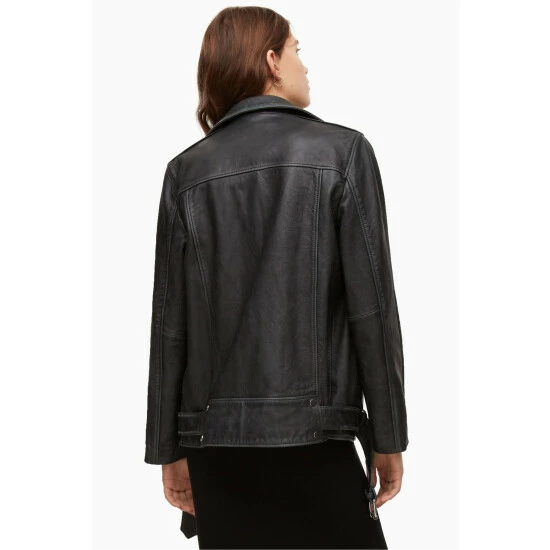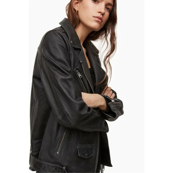 Oversized leather, we love it. The Billie Biker is a favourite. Crafted from smooth leather, it’s been heavily washed and tumbled for a high-low effect. Finished with metal stud detail and a classic belt. Zip closure. Long sleeve. Dropped shoulders. Three pockets. Snap ticket pocket. Removable beltShaped back panel with stud detail. Dull metal hardware. Branded roller buckle. Zip cuffs. Recycled lining. Heavily washed and tumbled. Model is 5’11″/180cm and is wearing size UK 10.AllSaints leather products support responsible manufacturing via the Leather Working Group.
