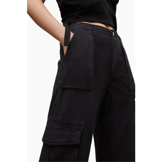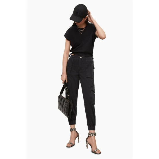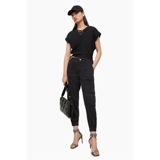 High rise. Zip closure. Two front pockets. Two back pockets. Two side pockets. Elasticated cuffs. Regular fit. Tapered leg. AllSaints cotton products support more sustainable cotton farming. Better cotton is sourced via a system of Mass Balance.
