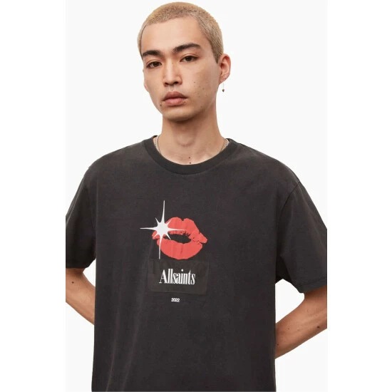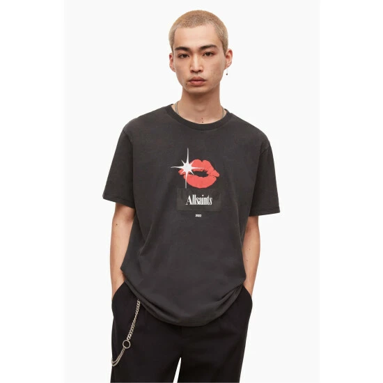 Sealed with a kiss. The Kiss Crew T-Shirt features our new printed graphic. Cut from cotton and shaped to a relaxed, easy fit. Pullover. Crew neck. Short sleeve. New season screen printed graphic. AllSaints signature branding. Model is 6’1″/185cm and is wearing size Medium. ALLSAINTS cotton products support more sustainable cotton farming. Better Cotton is sourced via a system of Mass Balance.