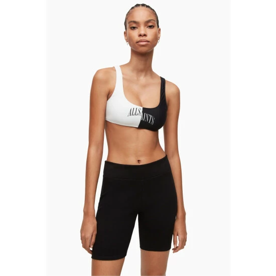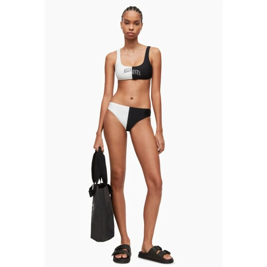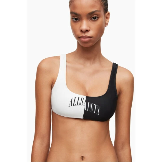 Slip on with regular fit. Simple bikini top with wider straps and low scoop neckline. Features their fun Split Saints graphic in contrast white and black for a bold graphic option.
