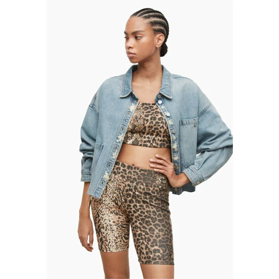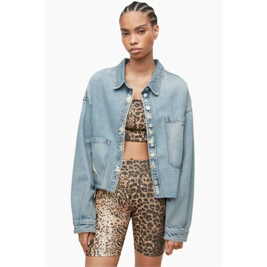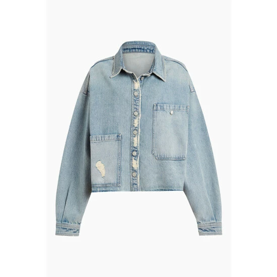 Button closure. Oversize fit. Short length. Round neck. Long sleeve. Destroys on the centre front button stand. Regular collar. Two patch pockets on the front. Left pocket has a branded popper and right pocket has a destroy. Two pockets. Unlined.