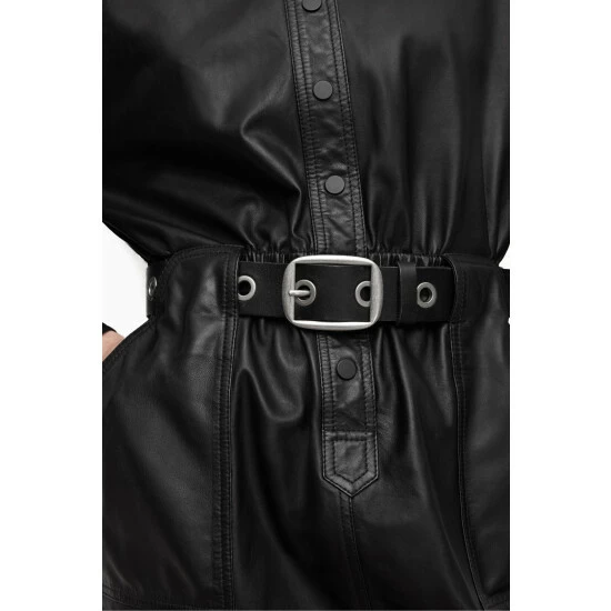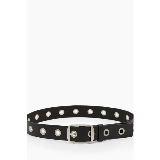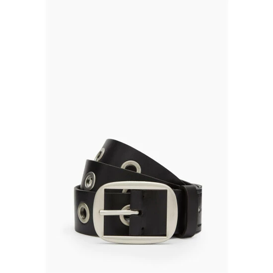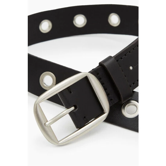 Flat eyelets along entire strap. fully adjustable. Width: 38mm. Smooth leather. eyelet detailing. Antique Nickel. Buckle-Zinc Alloy. Rivets- Brass. Blind emboss logo with stud detail at backtab. Sustainability attribute: LWG Gold Rated Tannery.