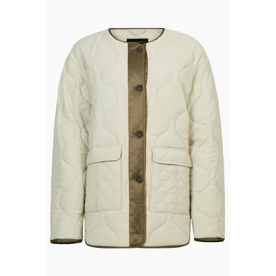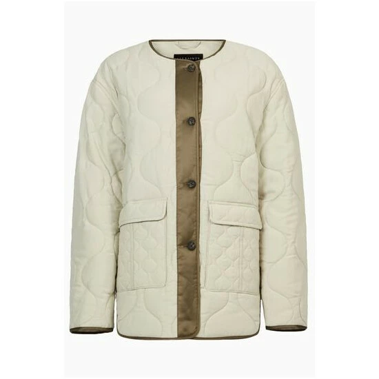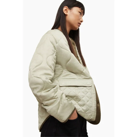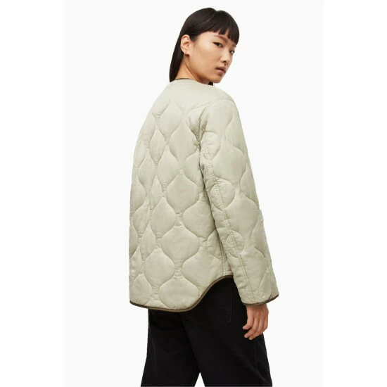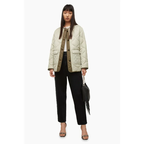 Do outerwear differently. The Foxi Liner Jacket features heavy quilting throughout. Made from sustainable fabrics with two front patch pockets and a contrasting centre front placket. Round neckButton closure. Long sleeve. Two front patch pockets. Onion quilting. Contrasting dark green placket and binding. Lined. Sustainable EcoVeroâ„¢ viscose. Model is 5’10.5″/179cm and wears size UK 10.