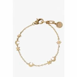 Delicate chain link bracelet featuring small star and crescent moon motif charms. This minimal celestial bracelet is set in brass metal and has an adjustable lobster clasp closure.