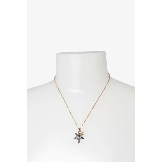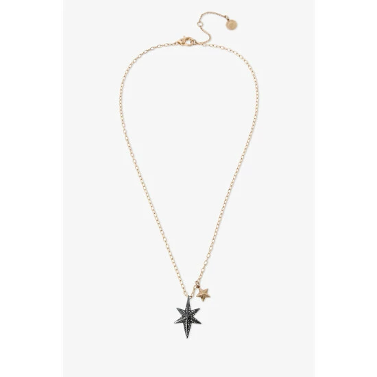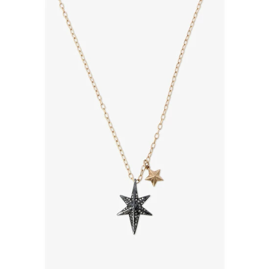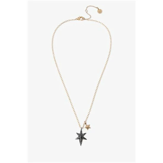 Delicate chain necklace featuring small star charm and contrasting hematite-tone starburst pendant detailed with minimal black diamond coloured pave. This celestial necklace is set in brass metal and has an adjustable lobster clasp closure.