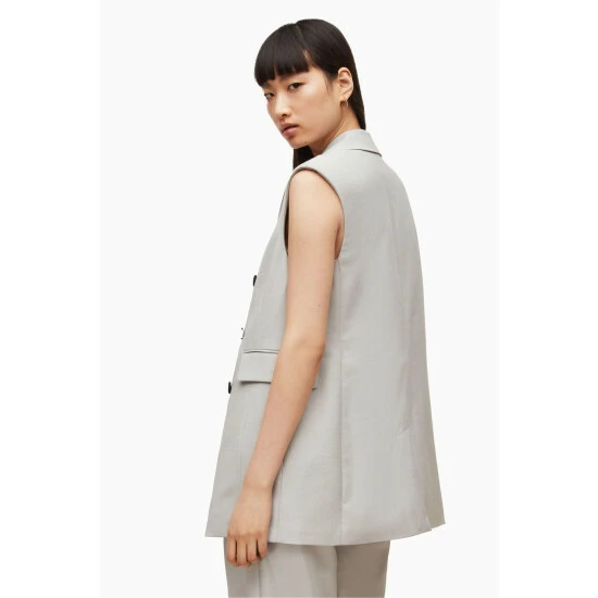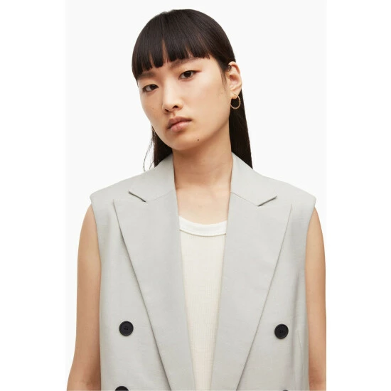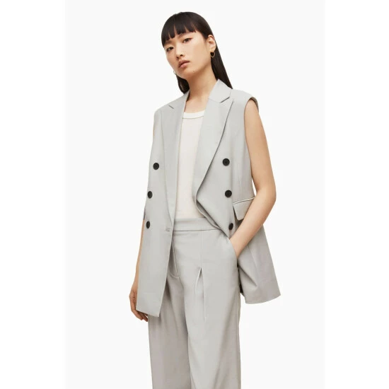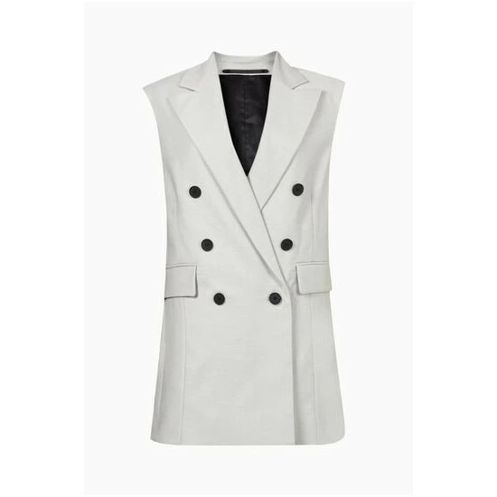 Double breast. Relaxed fit. Short length. Collar. Sleeveless. straight silhouette with peak lapel. 2 flap pockets and matt black buttons. 1 internal pocket. Lined. ALLSAINTS01-11-94 branded jacquard lining
