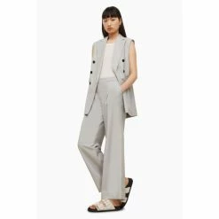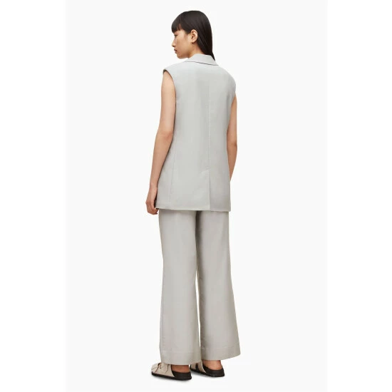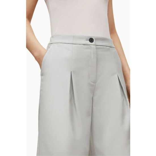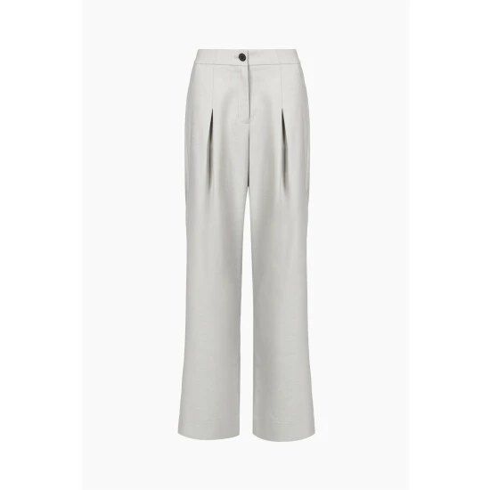 Zip and Button closure. Relaxed fit. Full Length. wide leg tailored full length trouser. Side pockets. deep front pleat. back belt with adjuster. two welt pockets with branded clip. High rise. Straight leg. Unlined. Internal branded jacquard tape at waistband.