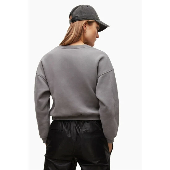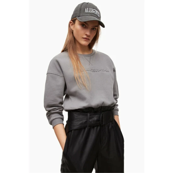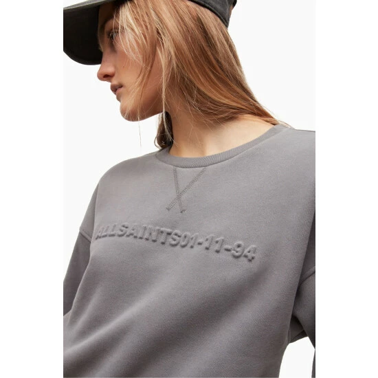 Pull over. Relaxed fit. Short length. Crew neck. Long sleeve. The Rei Sweat is a cropped shape with elasticated band at the hem. With Allsaints branding across the centre front chest in a tonal embossed technique. No Pockets.