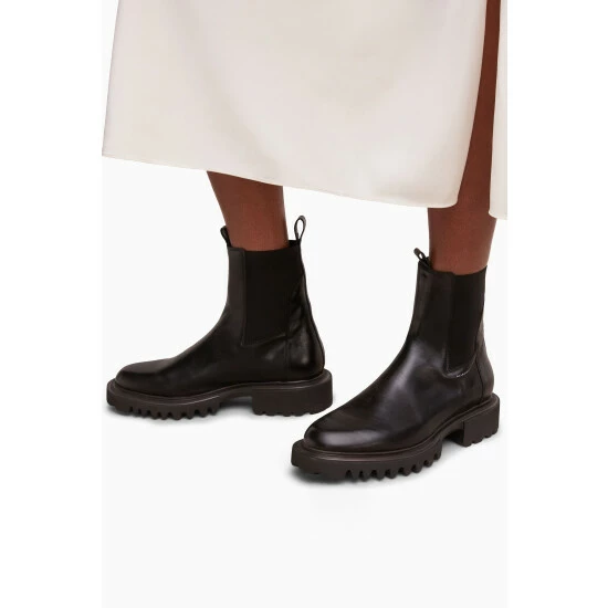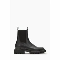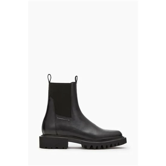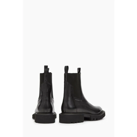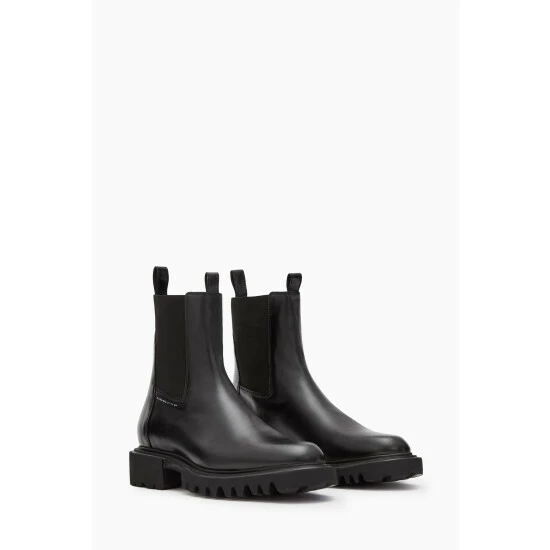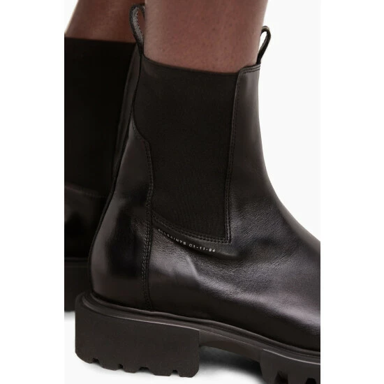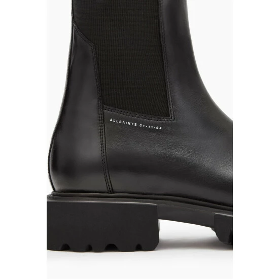 Round toe chunky sole boots with elastic gusset and two leather pull tabs. It features high shine finish. AllSaints leather products support responsible manufacturing via the Leather Working Group.