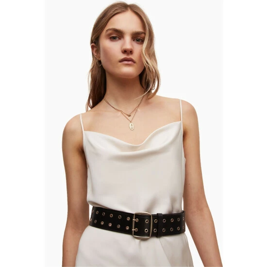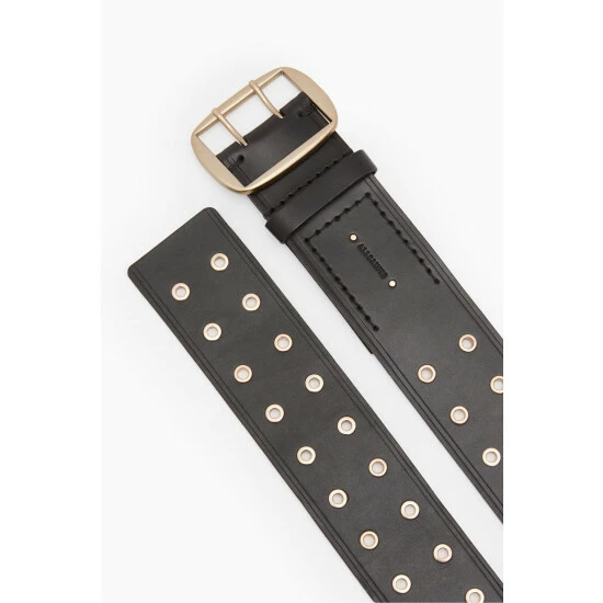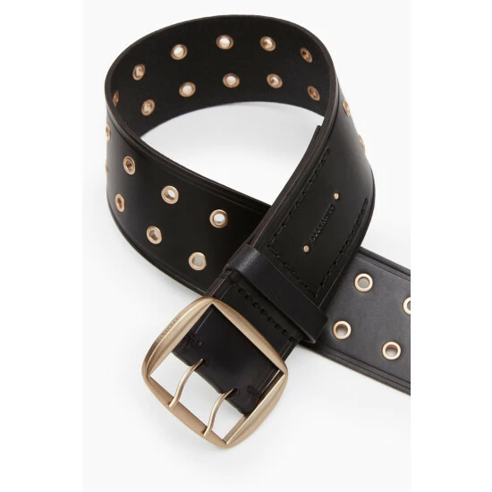 Metal centre bar buckle. Waist belt. Eyelet holes. Double prong buckle. Chrome free. AllSaints leather products support responsible manufacturing via the Leather Working Group. Width: 55mm. Measurements taken from the prong to the middle eyelet. XS: 78.7cm, S: 86.4cm, M: 94cm, L:101.6cm, XL:109.2cm.