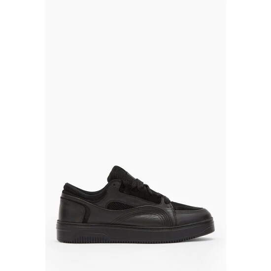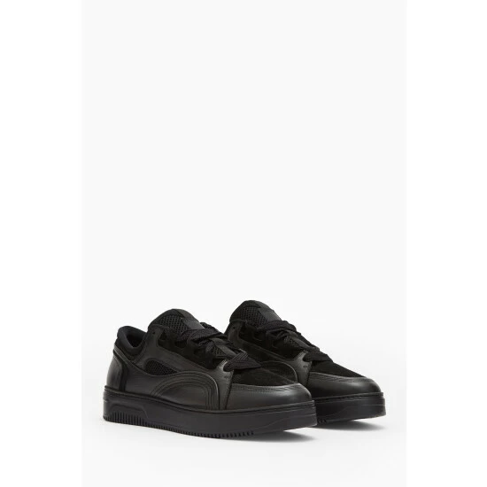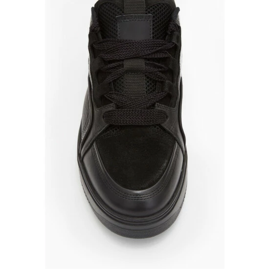 Lace up. Round toe with cup sole skate shoe with ghilli lace detail, wide laces and heat stamp.