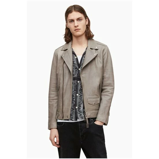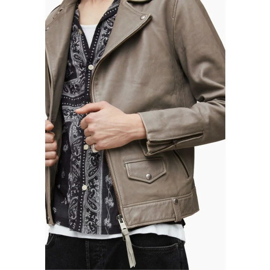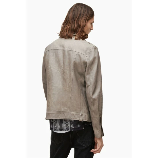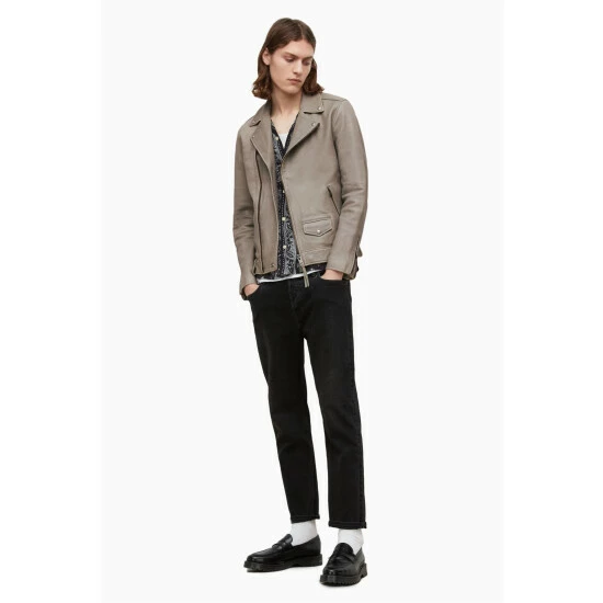 A simple and clean biker style with traditional detailing in a lighter taupe colour, long sleeves and with a collar and lapel. Heavily washed to create a vintage look, with baked creases on the sleeves. It features two lower side zip pockets, and one ticket pocket. It is a regular fit.