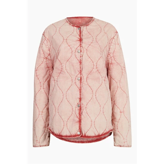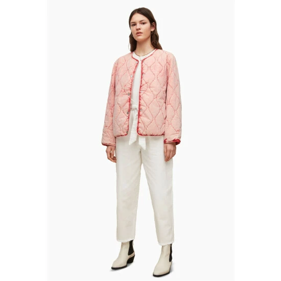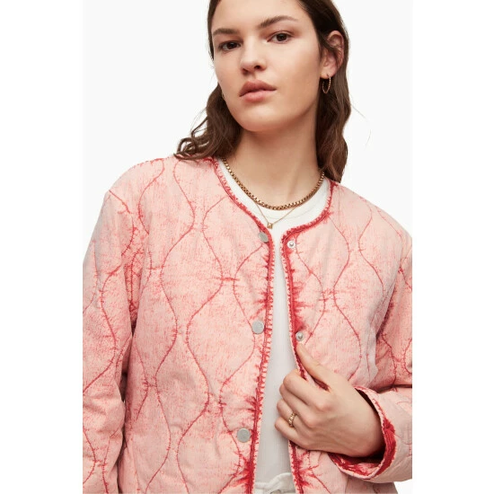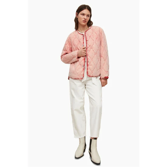 It is a regular fit. Designed with button closure, short length, round neck, long sleeves, dropped shoulder, oversized cocoon shaping.and curved hemline. Featuring pockets in side seam and branded snaps at centre front fastening and two pockets. It is lined and washed pink onion quilted liner jacket.