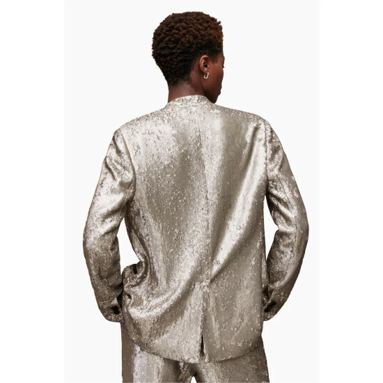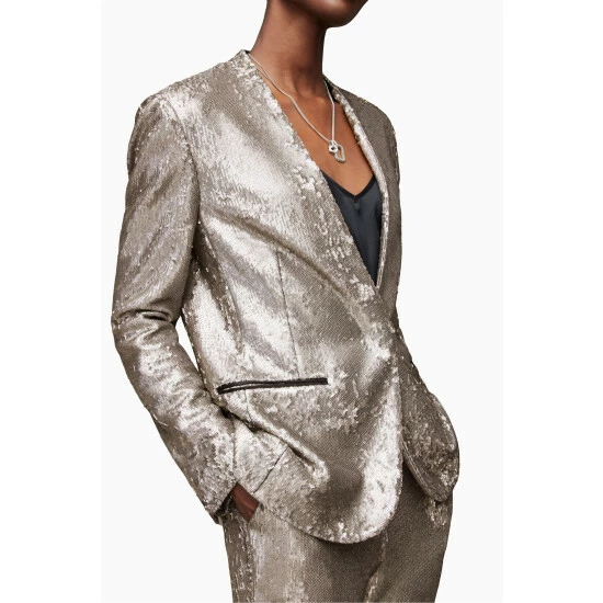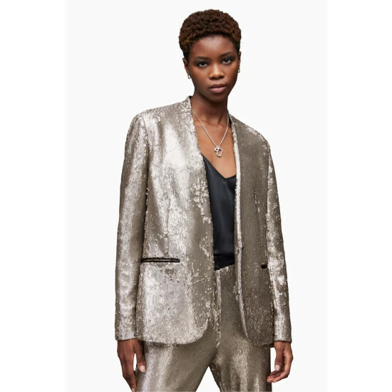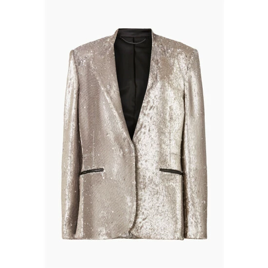 All over sequin blazer in single breasted slim fit shape. Clean front construction with no lapel, curved front hem shaping, dart details and two contrast jet pockets.