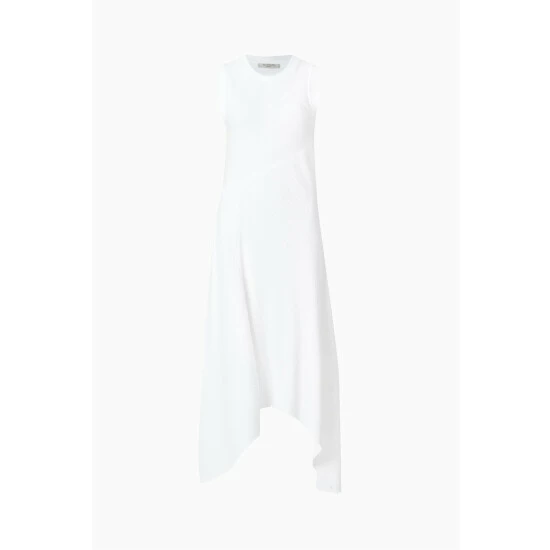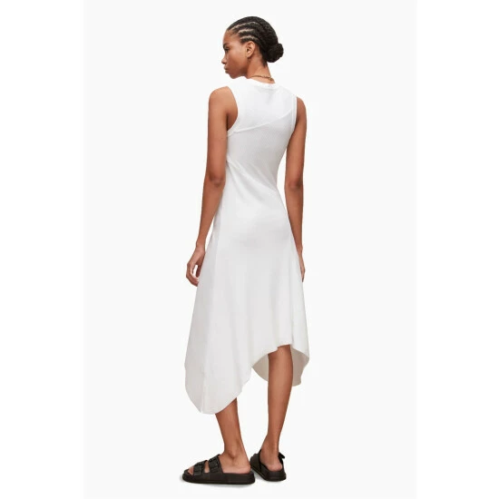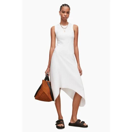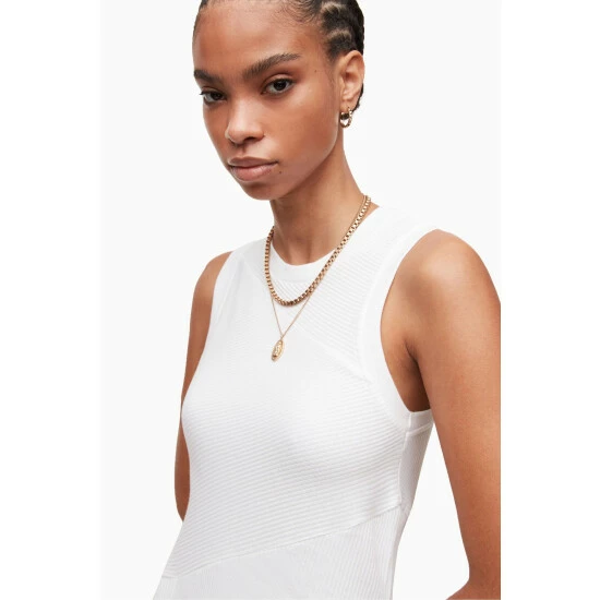 Pullover. Crew neck. Sleeveless. Ribbed texture. Midi length. Raw hem. ALLSAINTS cotton products support more sustainable cotton farming. Better Cotton is sourced via a system of Mass Balance. Slim fit