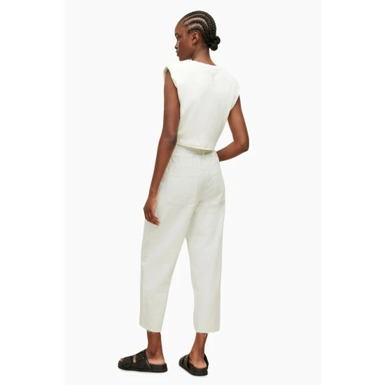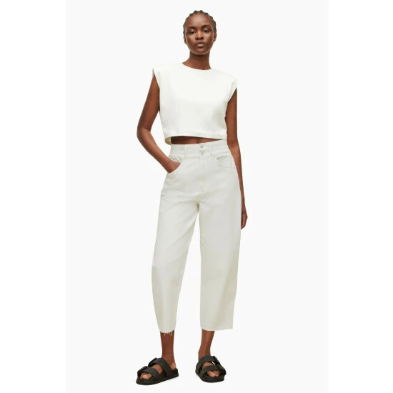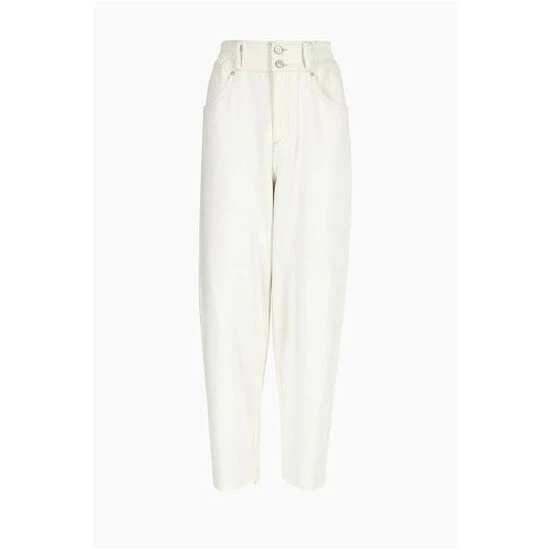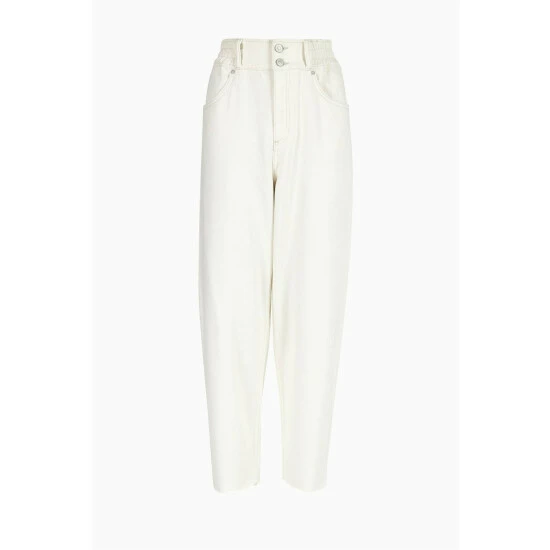 Zip closure. Oversized fit. Wide-leg relaxed fit jean. Elasticated waistband. Super-highwasited, finished with a two-button closure. They are slight tapered at the ankle with a finished hem. Three destroys on the leg. Two front pockets and one coin pocket on the wearers right. Two patch pockets on the back. Finished hems.