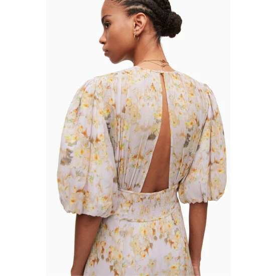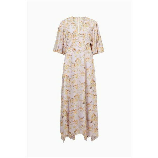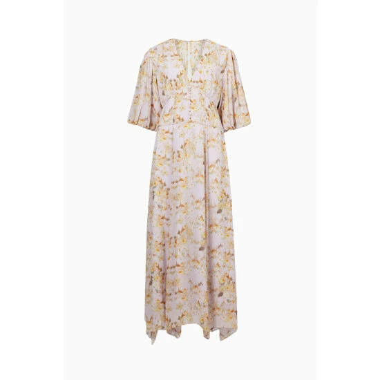 Featuring V-neckline, button closure, short sleeves, button waist and maxi-length. New season floral print – Momo: it means peach blossom in Japanese. Designed with frill standing collar, recycled materials and sustainable EcoVero™ viscose.