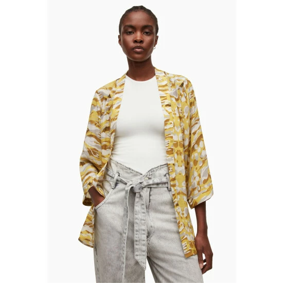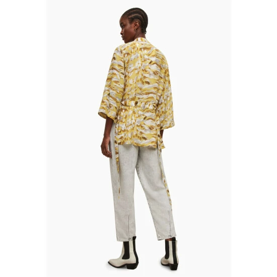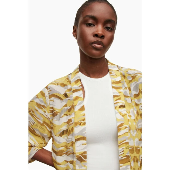 Kimonos are an ideal layering piece. The Carina is crafted from a lightweight, fluid fabric. Featuring our new Oniyuri print – it’s a tiger print camouflage inspired by the Akaishi Mountain range. Open front. New season Oniyuri print. 3/4 length sleeve. Kimono style. Side splits. Placket frames the neckline. Removable belt. Model is 5’10” and is wearing size UK 14.