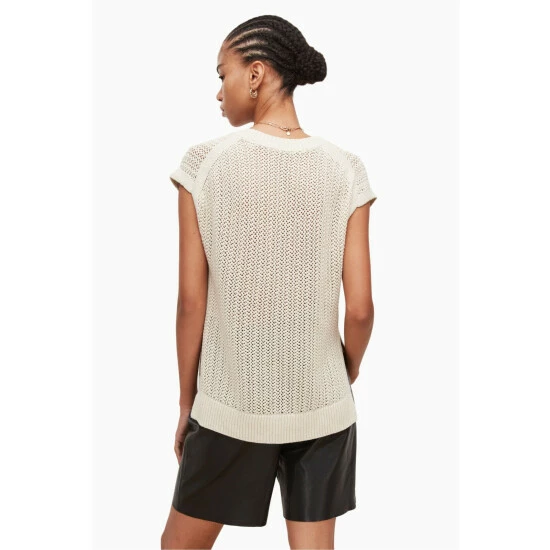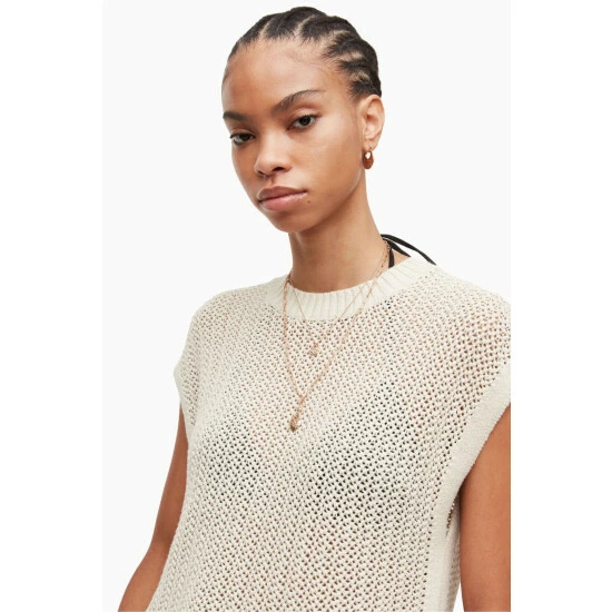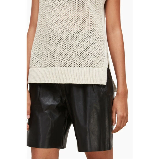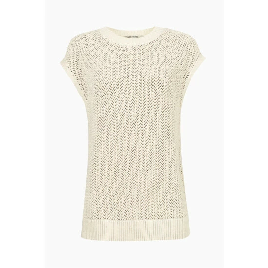 Featuring a pull-over design, crew neck, sleeveless, mesh stitch tank with high crew neck and deep rib trims, side splits and all needle stitch strappings at side seams and no pockets.