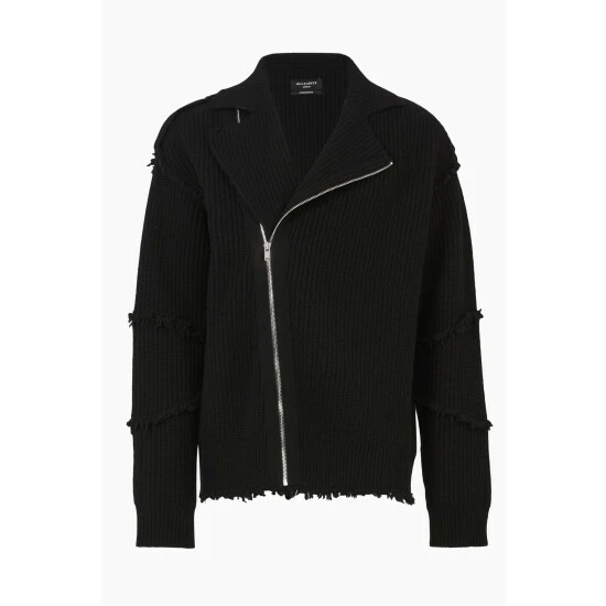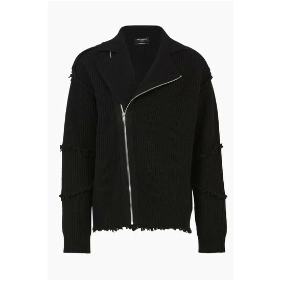 Biker jacket shape in knit inspired by biker jacket details, with epaulettes and elbow panels, all in cut raw seams Cut raw hem. Allover ribbed stitch. Allsaints branded imitation horn buttons on epaulettes. Allsaints branded zipper.