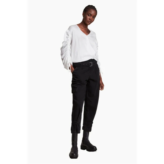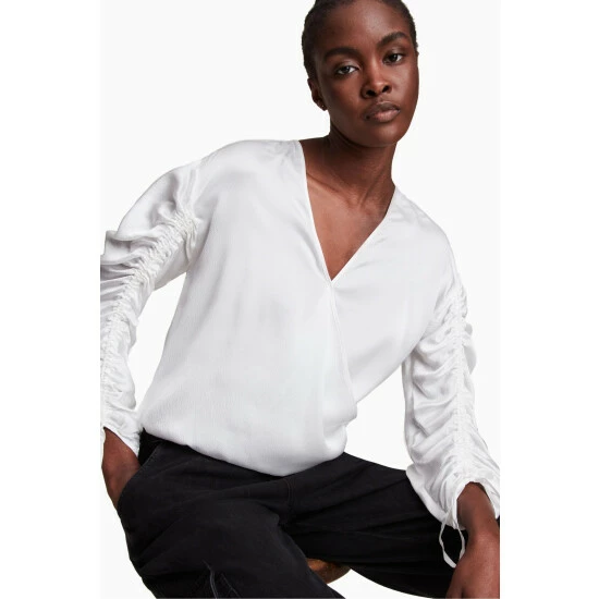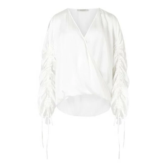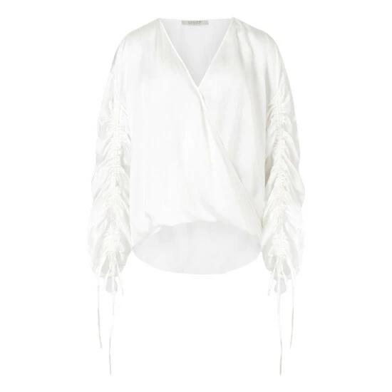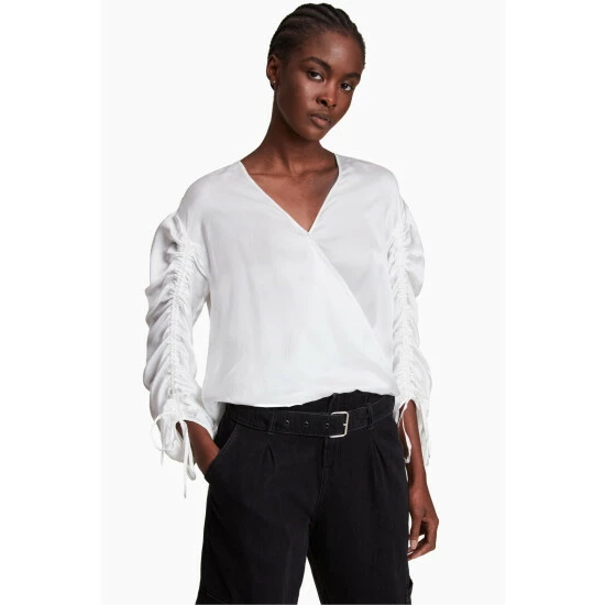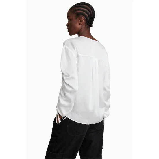 Pull over v-neck with long sleeves. Inspired by the classic penny top shape with a new update! Relaxed fit with dropped shoulder, front wrap twist and longer back hem. Comes with drawcords on sleeves that are fully adjustable and can be used to lengthen or shorten the sleeve length.