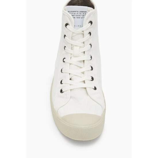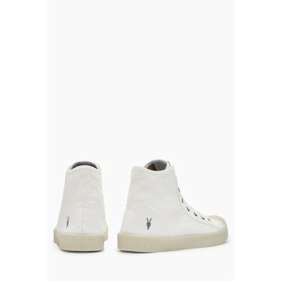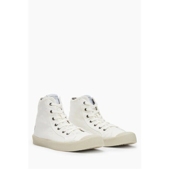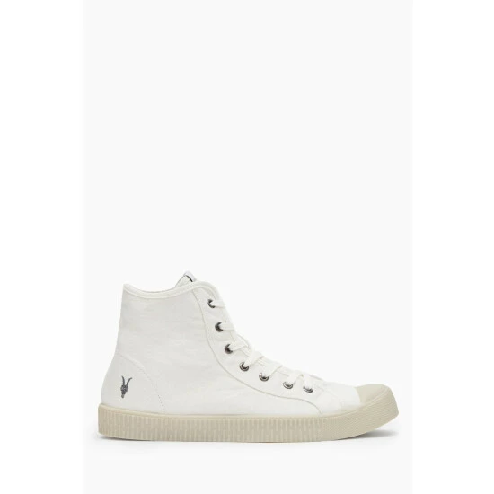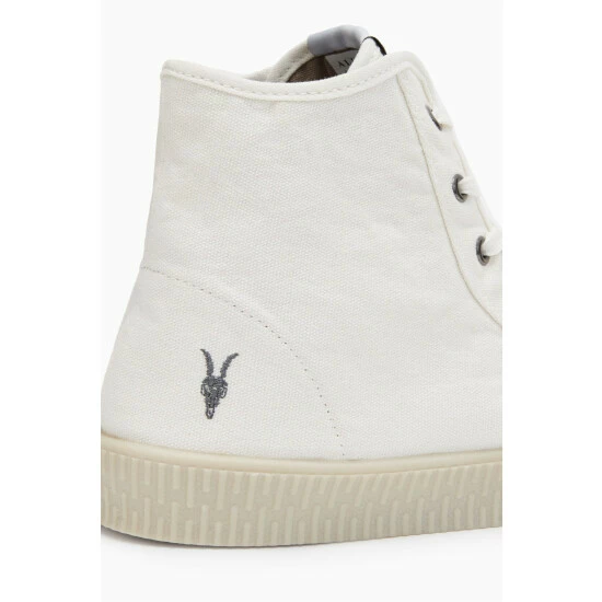 A lace-up and round toe, high top. A military surplus inspired long facing lace up with an injected rubber sole and ramskull embroidered heel. Ramskull embroidery in the heel.